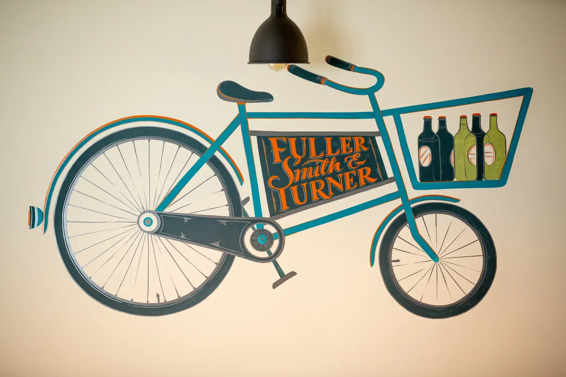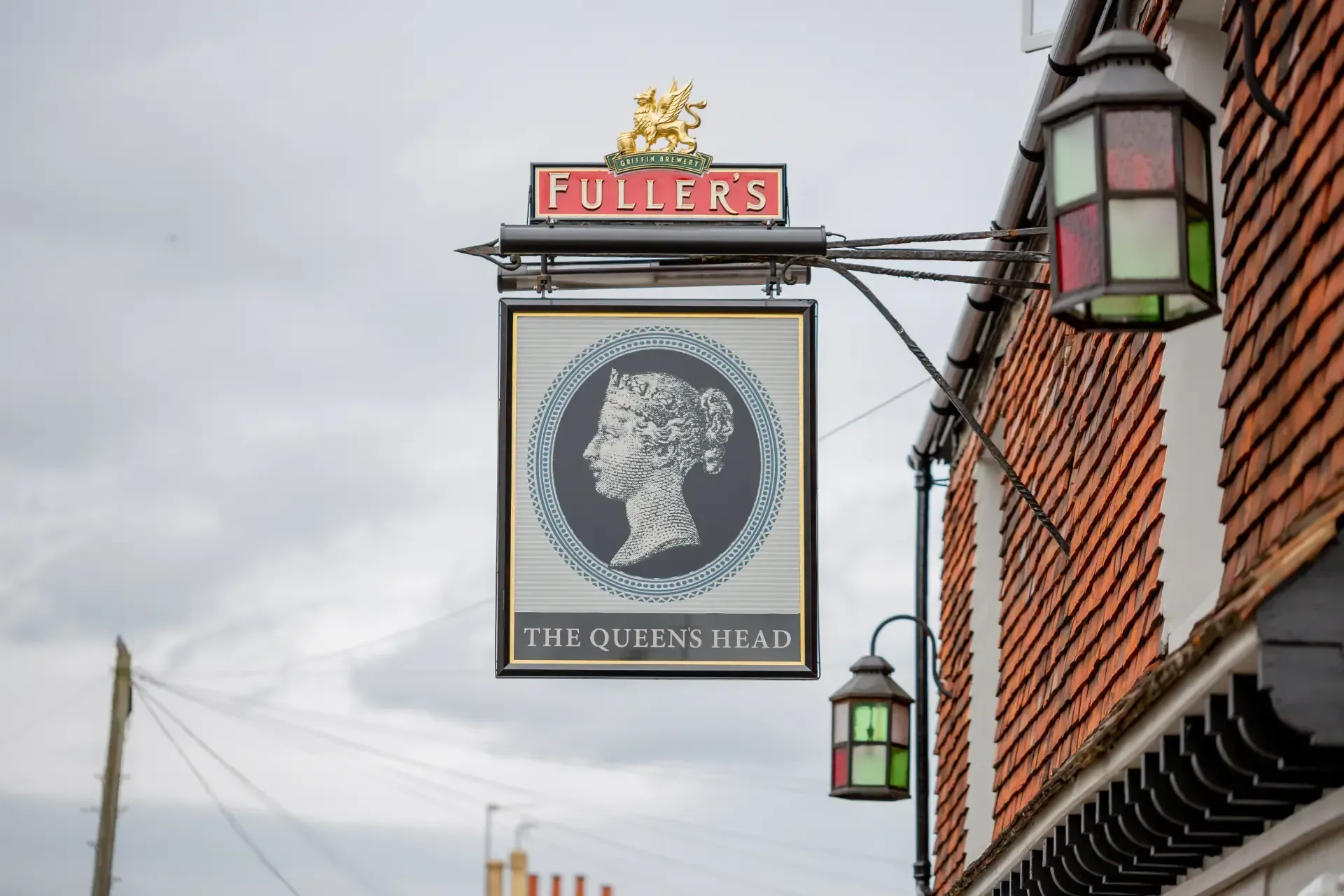 The Queens Head, Dorking | Fuller's Master Cellarman circular logo with text and a gryphon illustration.
